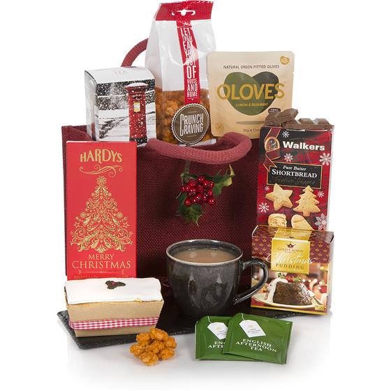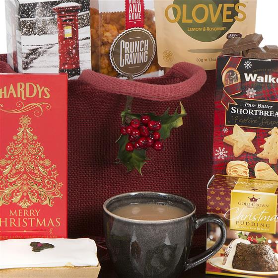 Walkers Pure Butter Shortbread Festive Shapes 60g,Crunch Craving Chilli Rice Crackers 80g,Original Cake Co Iced Top Fruit Cake 130g,Gold Crown Rich & Fruity Christmas Pudding 113g,Oloves Green Olives with Lemon and Rosemary 30g,New English Teas Tea Bags in Christmas Design Box (10),Hardys Merry Christmas Chocolate Bar 80g,POSTAL CARTON,JUTE BAG