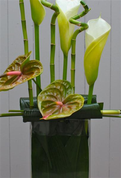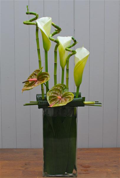 Simplicity itself, clean lines and two colours. This arrangement was inspired by a trip to New York and the contemporary floristry in the Big Apple. Arum lilies, anthuriums, bamboo and aspidistra leaves are used to create this statement piece.