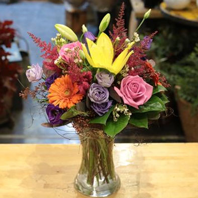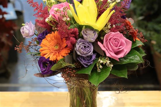 A petite hand tied bouquet in mixed vibrant colours including lilies, roses, mini gerberas, astilbe and lisianthus presented in a glass vase.