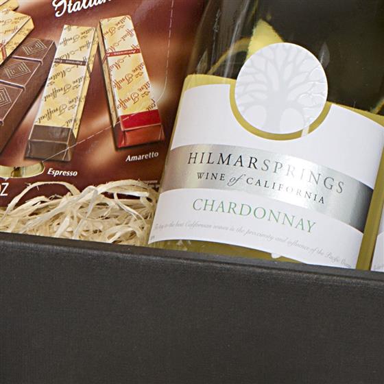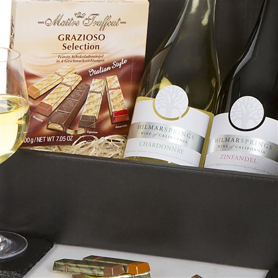 75cl Hilmar Springs Zinfandel Red 2015,75cl Hilmar Springs Chardonnay 2015,Maitre Truffout Grazioso Chocolate Selection 200g,Black Gift Box (360X190X90)
