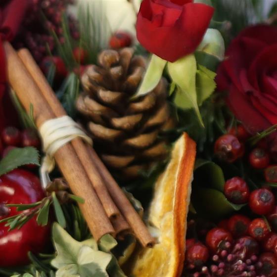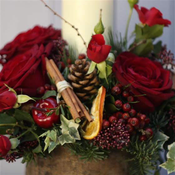 Lovely table centre set in a rustic ceramic pot. Features red seasonal flowers, festive foliages, decorations and a chunky church candle.