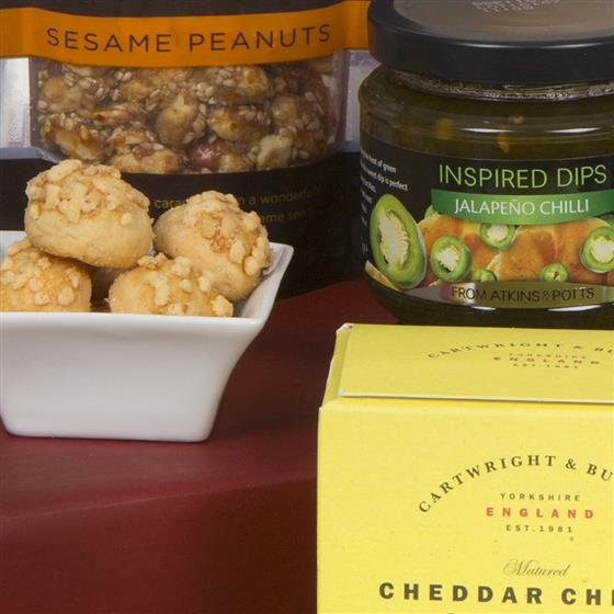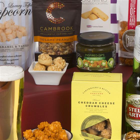 Bottle Stella Artois 330ml,NibNibs Rosemary Mini Breadsticks 100g,Thomas Tucker Salted Caramel and Vanilla Popcorn 125g,Cartwright & Butler Cheddar Cheese Crumbles 75g,Crunch Craving Chilli Rice Crackers 80g,Cambrook Brilliantly Sesame Peanuts 80g,Atkins & Potts Jalapeno Dip 205g,Gift Carton