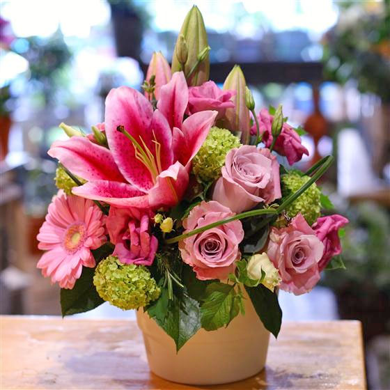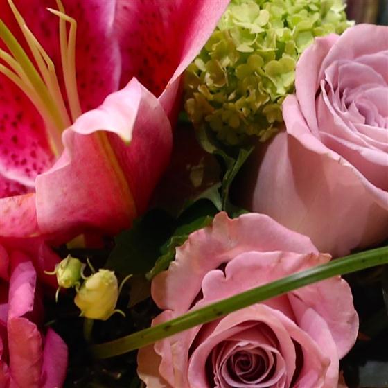 A delightful scented arrangement in shades of pink including lilies, roses and mini gerberas.