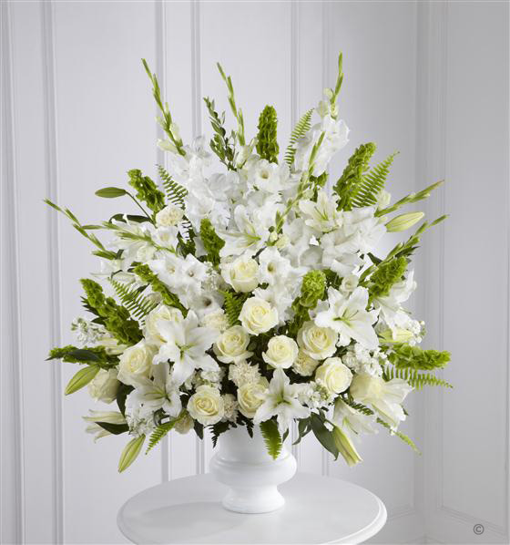 This stunning urn arrangment is a beautiful expression of peace and soft serenity. White roses, carnations, gladioli, stocks and Oriental Lily are accented with the bright green Stems of molucella and an assortment of foliage.