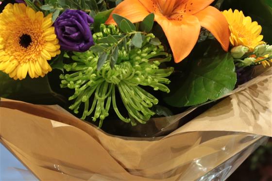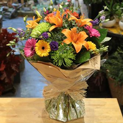 A striking bouquet of mixed blooms in bold shades including orange, cerise, lime, gold & purple.