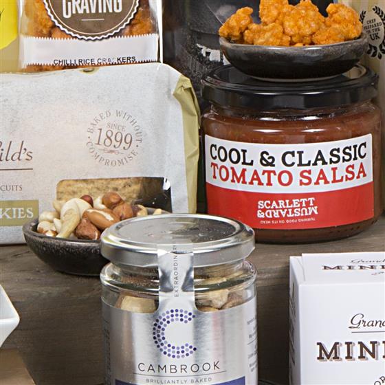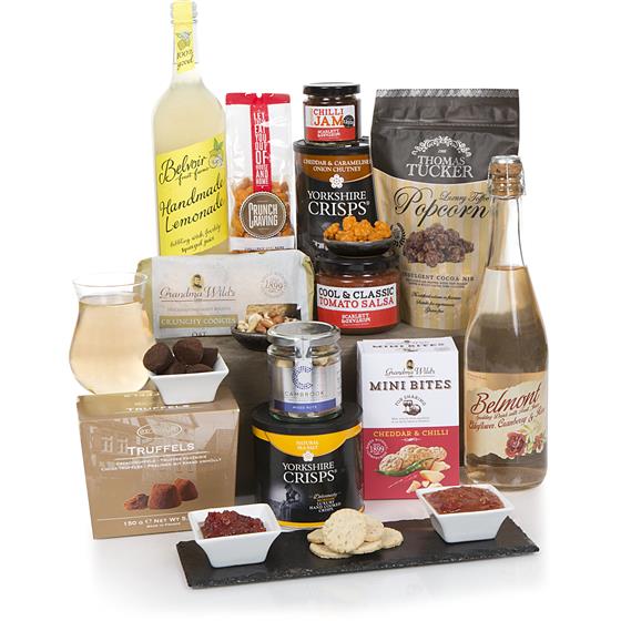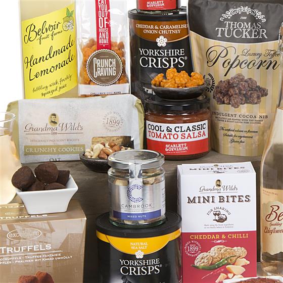 75cl Belvoir Lemonade,Belmont Elderflower, Cranberry & Rose Sparkling Drink 75cl,Grandma Wilds Cheddar and Chilli Mini Bites 100g,Thomas Tucker Indulgent Cocoa Nib Luxury Popcorn 125g,Grandma Wilds Oat Crunch Cookies 200g,Yorks Crisps Cheddar & Caramelised Onion 100g,Yorkshire Crisps Lightly Sea Salted 50g,Crunch Craving Chilli Rice Crackers 80g,Cambrook Mixed Nuts in a Jar 95g,Scarlett & Mustard Cool & Classic Tomato Salsa 300g,Scarlett & Mustard Chilli Jam 125g,Excelcium Cocoa Truffles 150g