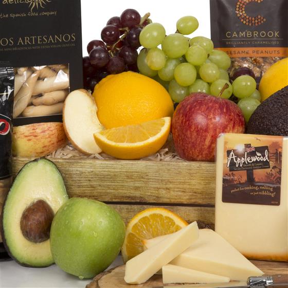 Picos Artesanos Breadsticks in Presentation Box 125g,Cambrook Sesame Peanuts 45g,Gancedo Fried and Salted Broad Beans 100g,Large Orange,Royal Gala Apple,Black/White Grapes 500g,Granny Smith Apple,Avocado,Finest Tunisian Dates 200g,Scarlett & Mustard Ploughmans Pickle 125g,Applewood Smoked Cheddar Wedge 150g,PRESENTATION TRAY