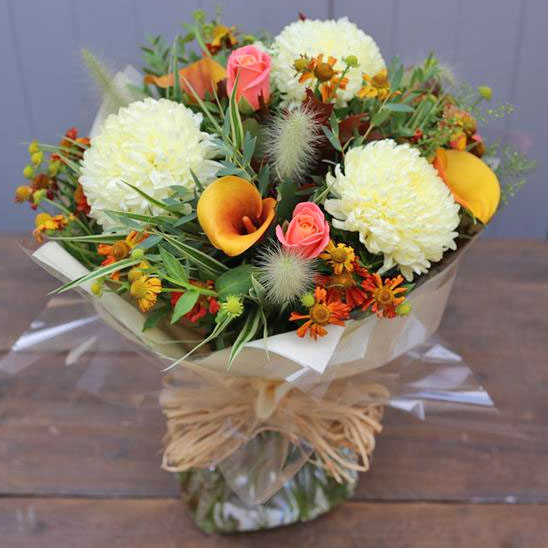 Cream chrysanthemum blooms, calla lilies and roses create this classic hand tied bouquet.