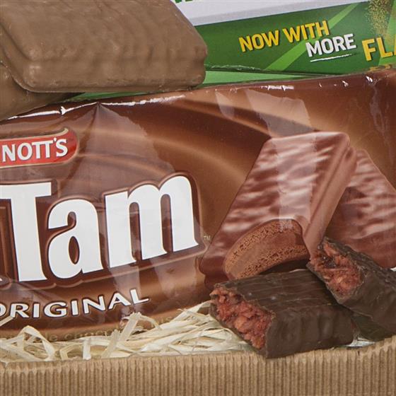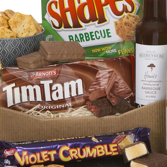 Wolf Blass Eaglehawk Chardonnay 75cl,Arnotts Barbecue Shapes 175g,AUS Arnotts Tim Tam Choc Biscuits 200g,Beerenberg Barbeque Sauce 300ml,Cherry Ripe 52g,Nestle Violet Crumble 50g,OPEN DISPLAY BOX