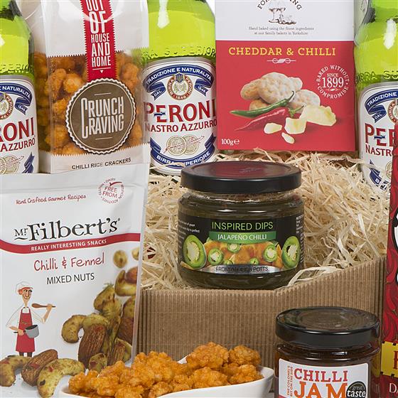 Peroni Nastro Azzuro 330ml,Grandma Wilds Cheddar and Chilli Mini Bites 100g,Crunch Craving Chilli Rice Crackers 80g,Mr Filberts Chilli and Fennel Mixed Nuts 50g,The Dangerous Food Co Jalapeno Jam 110g,Scarlett & Mustard Chilli Jam 125g,Hardys Hot Chilli Chocolate Bar 150g,OPEN DISPLAY BOX