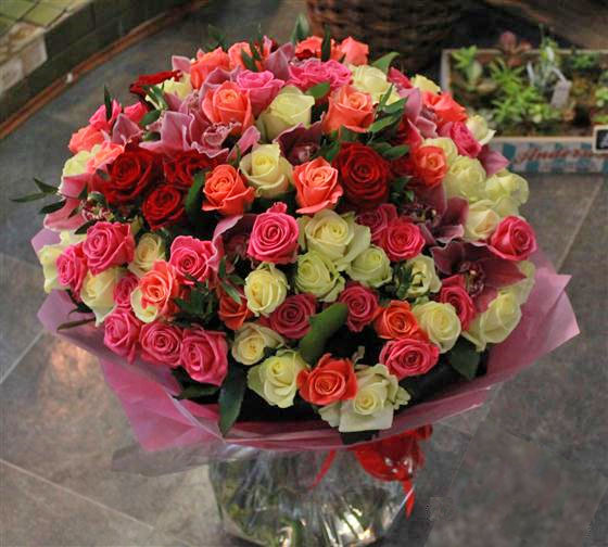 Please note that this is a mixed rose bouquet of the finest roses we have in stock.  Accompanied with stunning orchids. It is very large and will make someone extremely happy. Kisses guaranteed.