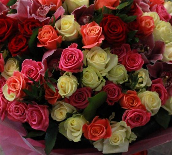 The ultimate statement for the true romantic - one hundred mixed roses with orchids in shades of red, pink and cream.