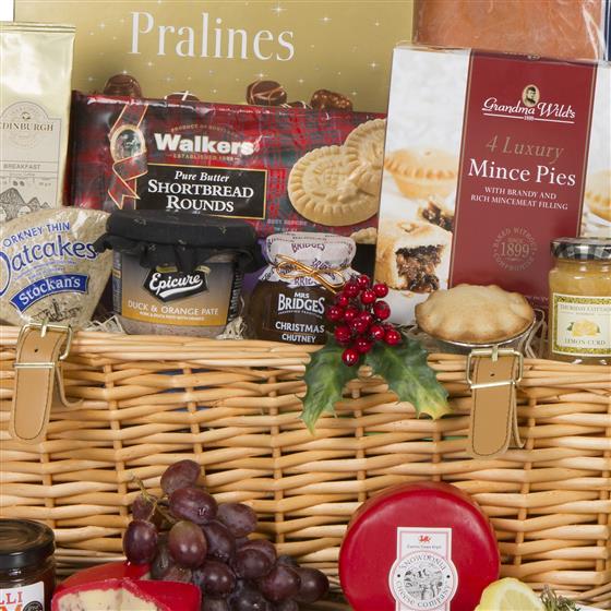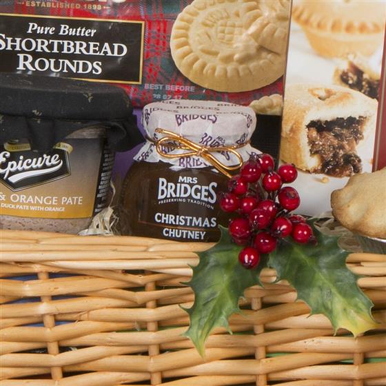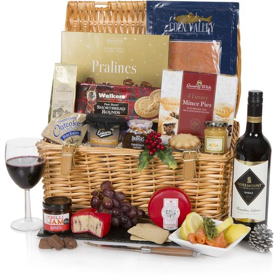 75cl Rosemount Founders Selection Shiraz 2015/6,Walkers Shortbread Thistle Rounds 100g,Stockans Orkney Thin Oatcakes 100g,Grandma Wilds 4 Lux Mince Pies with Brandy,Mrs Bridges Christmas Chutney 100g,Thursday Cottage Lemon Curd 110g,Scarlett & Mustard Chilli Jam 125g,Snowdonia Cheese Company Bouncing Berry 200g,Epicure Duck & Orange Pate 180g,Sliced Smoked Scottish Salmon 200g,Edinburgh Breakfast Coffee 56g,Xmas Excelcium Assorted Pralines in a Gold Box with Stars 180g,WICKER HAMPER