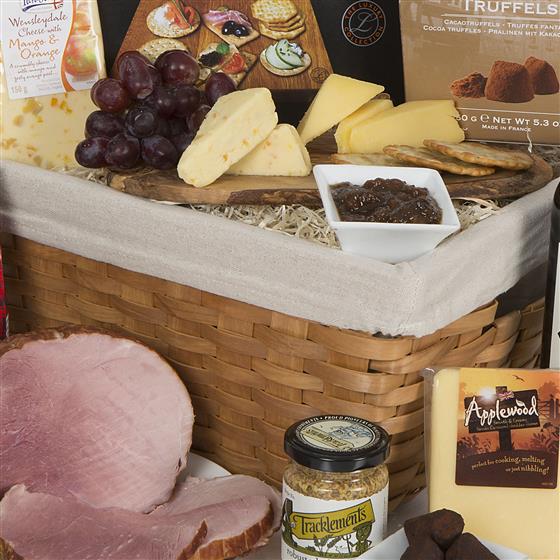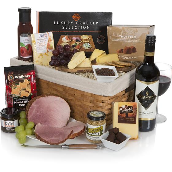 75cl Rosemount Founders Selection Shiraz 2015/6,Walkers Pure Butter Shortbread Mini Scottie Dogs 125g,Gourmet Luxury Cracker Selection 250g,Tracklements Wholegrain Mustard 140g,Atkins & Potts Raspberry Coulis 250g,Scarlett & Mustard Ploughmans Pickle 125g,Wensleydale with Mango & Orange 150g,Applewood Smoked Cheddar Wedge 150g,Roast Smoked Belgian Ham 700g,Excelcium Cocoa Truffles 150g,LINED BAMBOO BASKET
