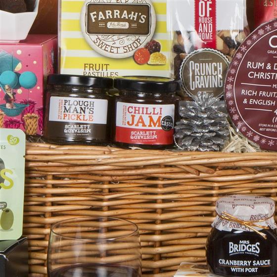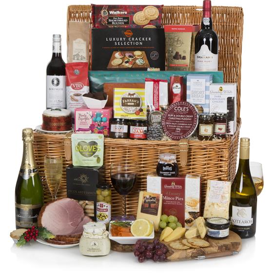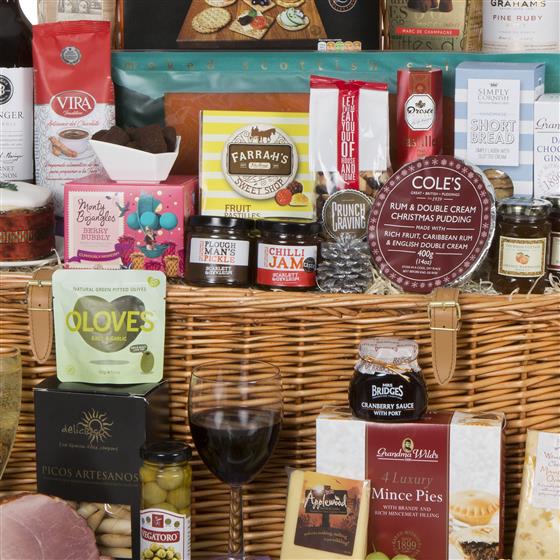 75cl Autreau Roualet Brut NV Champagne,75cl Grahams Fine Ruby Port,75cl Beringer Classic Cab Sauv 2015/6,Aotearoa Sauvignon Blanc 2016 75cl,Gourmet Luxury Cracker Selection 250g,Walkers Shortbread Thistle Rounds 100g,Simply Cornish Clotted Cream Shortbread 200g,Picos Artesanos Breadsticks in Presentation Box 125g,Grandma Wilds Chocolate Coated Gingers 150g,Gold Crown Round Iced Christmas Cake 400g,Crunch Craving Fruit & Nut Mix 250g,Coles Brandy Christmas Pudding 227g,Grandma Wilds 4 Lux Mince Pies with Brandy,Thursday Cottage Raspberry Jam 112g,Thursday Cottage Orange Marmalade 112g,Oloves Green Olives with Basil and Garlic 30g,Tracklements Damson Fruit Cheese 100g,Scarlett & Mustard Ploughmans Pickle 125g,Mrs Bridges Cranberry Sauce with Port 113g,Scarlett & Mustard Chilli Jam 125g,Mrs Bridges Lime & Basil Mayonnaise 180g,Vegatora Whole Manzanillo Olives 150g,Wensleydale with Mango & Orange 150g,Applewood Smoked Cheddar Wedge 150g,Roast Smoked Belgian Ham 700g,Sliced Smoked Scottish Salmon 500g,Vira Hot Chocolate Powder 180g,Edinburgh Tea and Coffee Co After Dinner Ground Coffee 113g,Monty Bojangles Berry Bubbly Raspberry Cocoa Dusted Truffles 150g,Droste Dark Chocolate Pastilles 100g,Farrahs Fruit Pastilles 125g,Mathez Marc de Champagne Cocoa Dusted Truffles 200g,WICKER HAMPER