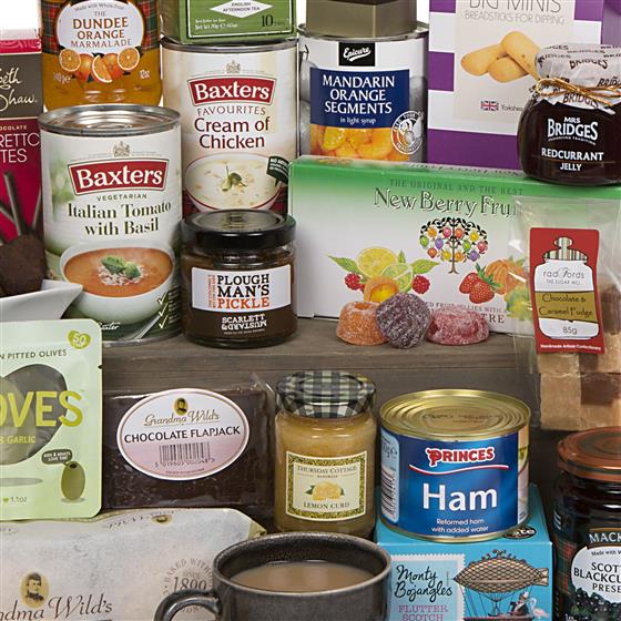 NibNibs Rosemary Mini Breadsticks 100g,Grandma Wilds Oat Crunch Cookies 200g,Grandma Wilds Chocolate Flapjack 120g,Epicure Mandarin Orange Segments in Light Syrup 312g,Mackays Scottish Blackcurrant Preserve 340g,Mackays Dundee Orange Marmalade 340g,Oloves Green Olives with Basil and Garlic 30g,Thursday Cottage Lemon Curd 110g,Mrs Bridges Redcurrant Jelly 113g,Scarlett & Mustard Ploughmans Pickle 125g,Princes Ham 200g,Baxters Cream of Chicken Soup 400g,Baxters Italian Tomato Soup w Basil 400g,New English Teas English Afternoon Teabags (10),Elizabeth Shaw Amaretto Flutes 105g,New Berry Fruits 100g,Radfords Chocolate & Caramel Fudge 85g,Monty Bojangles Flutter Scotch Curious Truffles 100g