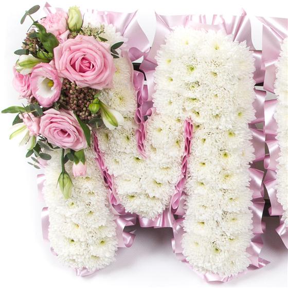 Our massed letter tributes are available with a white chrysanthemum base and sprays in a range of colours - if you require a different colour to those listed please specify in the delivery instructions at the checkout.