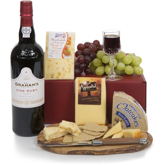 75cl Grahams Fine Ruby Port,Stockans Orkney Thin Oatcakes 100g,Wensleydale with Mango & Orange 150g,Applewood Smoked Cheddar Wedge 150g,Gift Carton