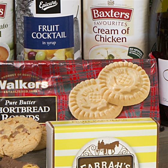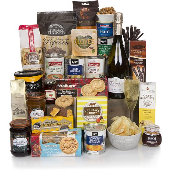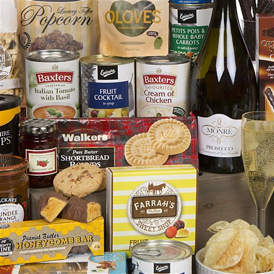 Cortefresca Prosecco 75cl,Crunch Craving Bombay Mix 175g,Walkers Shortbread Thistle Rounds 100g,Walkers Salted Caramel & Milk Chocolate Cookies 150g,Thomas Tucker Indulgent Cocoa Nib Luxury Popcorn 125g,Grandma Wilds Mature Cheddar Oaty Biscuits 130g,Yorkshire Crisps Lightly Sea Salted 50g,Cambrook Brilliantly Sesame Peanuts 80g,Epicure Mandarin Orange Segments in Light Syrup 312g,Epicure Fruit Cocktail in Syrup 415g,Epicure Petits Pois & Baby Carrots 400g,Thursday Cottage Raspberry Jam 112g,Mackays Scottish Blackcurrant Preserve 340g,Mackays Dundee Orange Marmalade 340g,Oloves Green Olives with Lemon and Rosemary 30g,Mrs Bridges Redcurrant Jelly 113g,Princes Ham 200g,Baxters Cream of Chicken Soup 400g,Baxters Italian Tomato Soup w Basil 400g,Edinburgh Breakfast Coffee 56g,Mighty Fine Peanut Butter Honeycomb Bar 42g,Maitre Truffout Dark Chocolate Coffee Sticks 75g,Farrahs Fruit Pastilles 125g