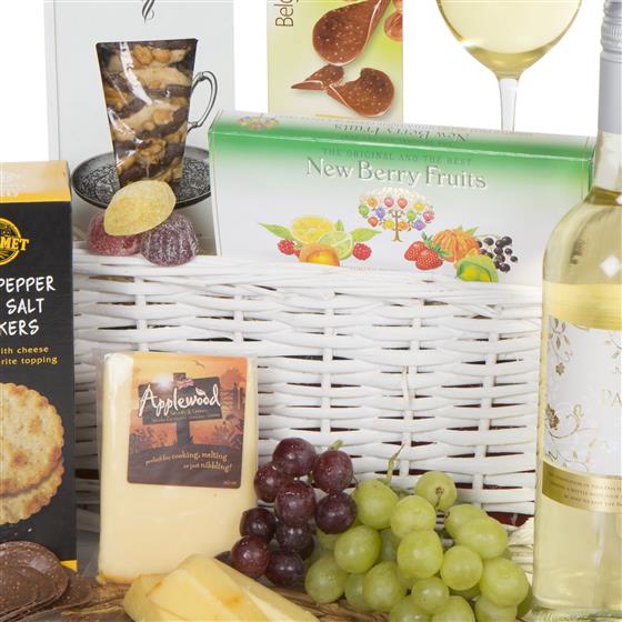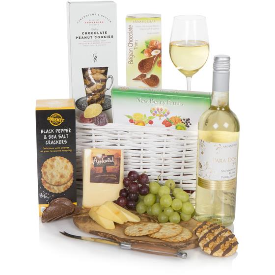 75cl Para Dos Sauvignon Blanc Torrontes 2015,Gourmet Black Pepper & Sea Salt Crackers 185g,Cartwright & Butler Chocolate Peanut Cookies 150g,Applewood Smoked Cheddar Wedge 150g,Belgian Chocolate Hazelnut Thins 80g,New Berry Fruits 100g,OPEN WILLOW BASKET