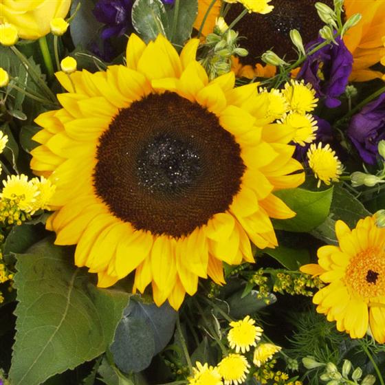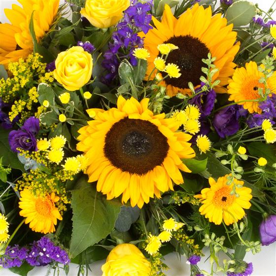 A natural style casket spray of summer blooms including sunflowers, larkspur, roses and solidaster. Sunflowers subject to seasonal availability.
