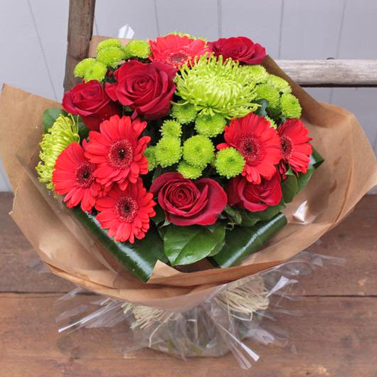 Rich red roses, red suri germini, lime shamrock blooms and feeling green chrysanthemums grouped and accentuated with folded aspidistra leaves. A popular choice.
