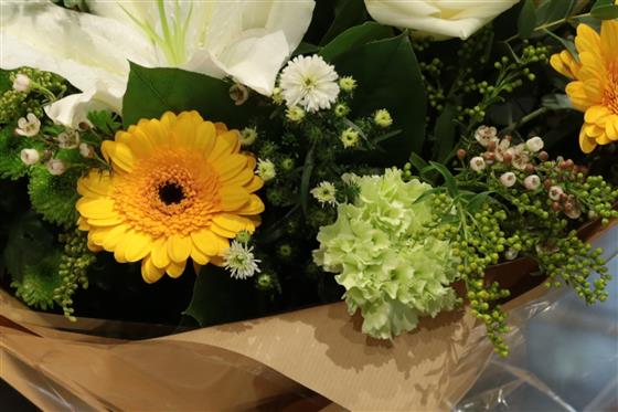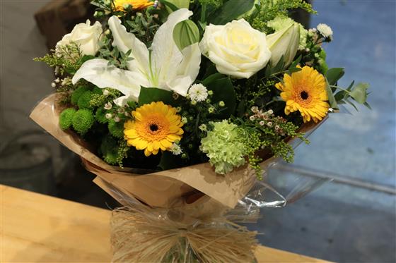 A crisp white and lime hand tied bouquet including roses, lilies and chrysanthemums highlighted with sunshine yellow mini gerberas.