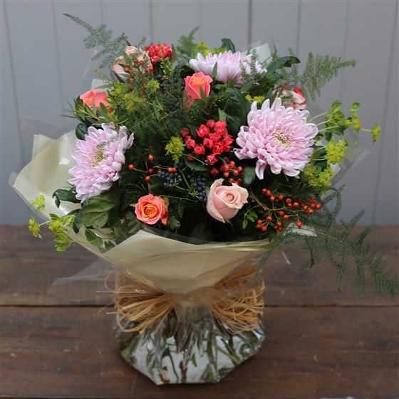 Wispy foliage and delicate blooms give this bouquet a just picked from the garden feel. Created using roses, bouvardia and single chrysanthemums.