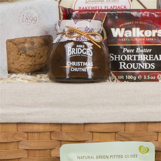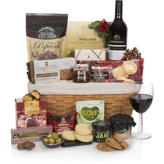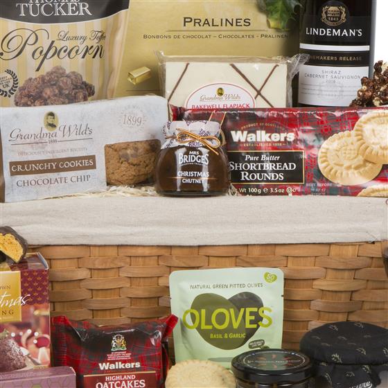 75cl Lindemans Winemakers Release Shiraz Cab Sauv 16,Walkers Shortbread Thistle Rounds 100g,Grandma Wilds Bakewell Flapjack 120g,Thomas Tucker Indulgent Cocoa Nib Luxury Popcorn 125g,Walkers Highland Oatcakes 75g,Grandma Wilds Chocolate Chip Crunch Cookies 200g,Gold Crown Xmas Pudding 227g,Oloves Green Olives with Basil and Garlic 30g,The Dangerous Food Co Jalapeno Jam 110g,Mrs Bridges Christmas Chutney 100g,Epicure Duck & Orange Pate 180g,Xmas Excelcium Assorted Pralines in a Gold Box with Stars 180g,Mighty Fine Peanut Butter Honeycomb Bar 42g,LINED BAMBOO BASKET