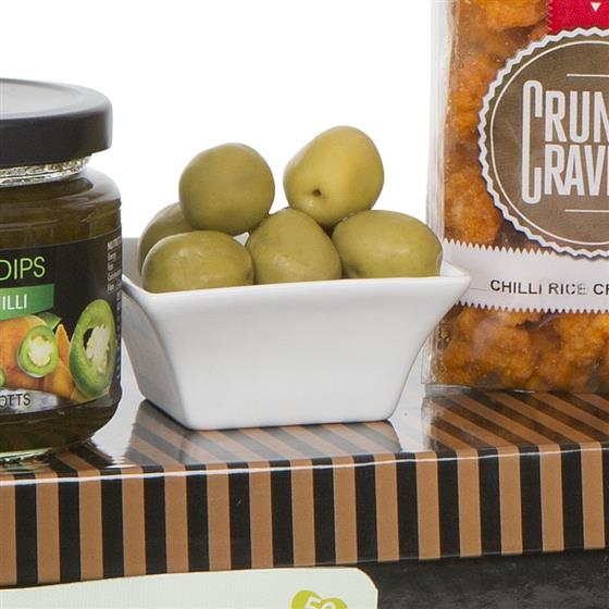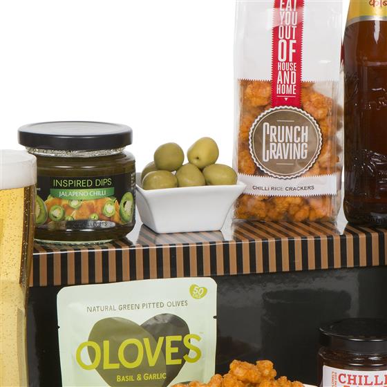 Cobra Premium Beer 330ml,Crunch Craving Chilli Rice Crackers 80g,Oloves Green Olives with Basil and Garlic 30g,Atkins & Potts Jalapeno Dip 205g,Scarlett & Mustard Chilli Jam 125g,PRESENTATION BOX
