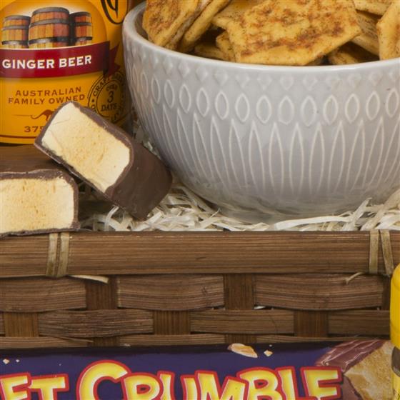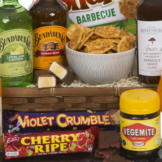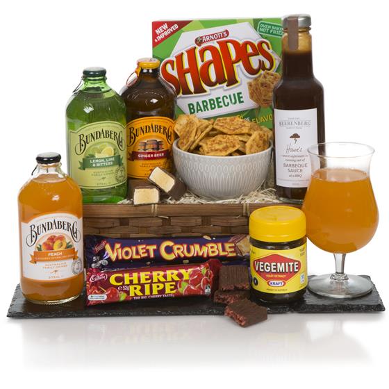 Bundaberg Peach flavoured Sparkling Drink 375ml,Bundaberg Lemon Lime & Bitters 375ml,Bundaberg Ginger Beer 375ml,Arnotts Barbecue Shapes 175g,AUS Vegemite 220g,Beerenberg Barbeque Sauce 300ml,Cherry Ripe 52g,Nestle Violet Crumble 50g,Large Honey Coloured Bamboo Tray (380X280X90)