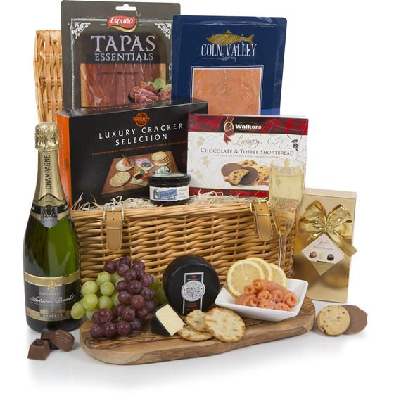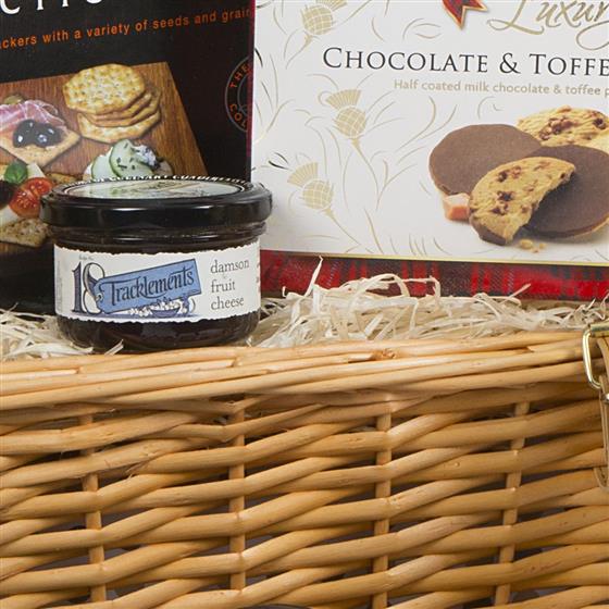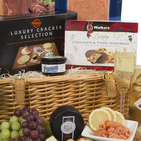 75cl Autreau Roualet Brut NV Champagne,Gourmet Luxury Cracker Selection 250g,Walkers Luxury Chocolate & Toffee Shortbread 160g,Tracklements Damson Fruit Cheese 100g,Snowdonia Cheese Co Black Bomber 200g,Espuna Serrano Ham 70g,Sliced Smoked Scottish Salmon 200g,Hamlet Gold Box Assorted Chocolates 125g,WICKER HAMPER