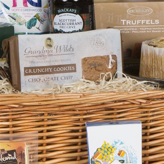 75cl Autreau Roualet Brut NV Champagne,75cl Los Pastos Merlot 2015/16,75cl Los Pastos Sauvignon Blanc 2015/16,Cartwright & Butler Butter Thins 75g,Gourmet Luxury Cracker Selection 250g,NibNibs Rosemary Mini Breadsticks 100g,Thomas Tucker Indulgent Cocoa Nib Luxury Popcorn 125g,Grandma Wilds Oat Crunch Cookies 200g,Cartwright & Butler Cheddar Cheese Crumbles 75g,Yorkshire Crisps Lightly Sea Salted 50g,Cartwright & Butler Chocolate Wafer Rounds 120g,Grandma Wilds Chocolate Chip Crunch Cookies 200g,Original Cake Co Dundee Whisky Round 400g,Cambrook Mixed Nuts in a Jar 95g,Mackays Scottish Blackcurrant Preserve 340g,Mackays Dundee Orange Marmalade 340g,The Dangerous Food Co Jalapeno Jam 110g,Oloves Green Olives with Lemon and Rosemary 30g,Atkins & Potts Raspberry Coulis 250g,Tracklements Onion Marmalade 110g,Applewood Smoked Cheddar Wedge 150g,Smoked Chicken Breast 160g,Epicure Duck & Orange Pate 180g,Sliced Smoked Scottish Salmon 500g,Edinburgh Tea and Coffee Co After Dinner Ground Coffee 113g,Ahmad Classic Tea Selection 40g,Hope and Greenwood Mint Meltinis 100g,Hope and Greenwood Caramel and Salt Fudge 150g,Radfords Vanilla Fudge Box 100g,Excelcium Cocoa Truffles 150g,WICKER HAMPER