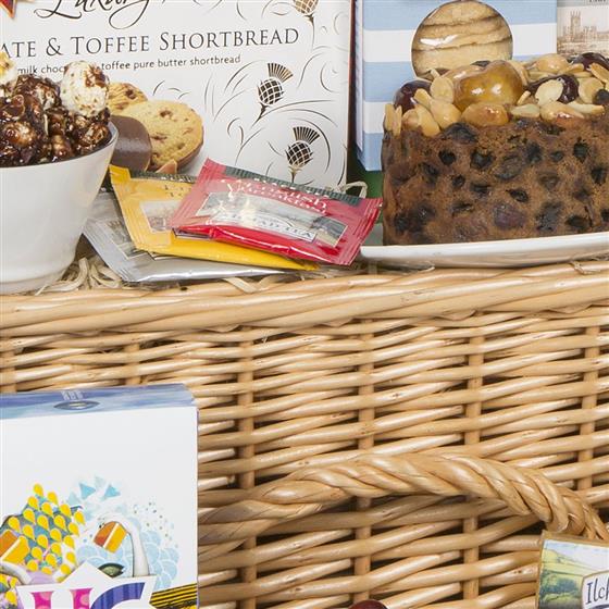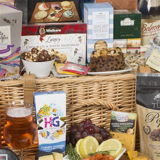 Belmont Elderflower, Cranberry & Rose Sparkling Drink 75cl,75cl Belvoir Raspberry Lemonade,Gourmet Luxury Cracker Selection 250g,Simply Cornish Clotted Cream Shortbread 200g,Thomas Tucker Indulgent Cocoa Nib Luxury Popcorn 125g,Walkers Luxury Chocolate & Toffee Shortbread 160g,Original Cake Co Cherry & Almond Topped Cake Round 400g,Double Gloucester with Chive and Onion 150g,Snowdonia Cheese Co Black Bomber 200g,Smoked Duck Sliced 100g,Sliced Smoked Scottish Salmon 200g,Ahmad Classic Tea Selection 40g,Cartwright and Butler Soft Fruit Jellies in Kilner Jar 190g,Hope and Greenwood Caramel and Salt Fudge 150g,Monty Bojangles Taste of Adventure Truffles in Presentation Box 225g,WICKER HAMPER