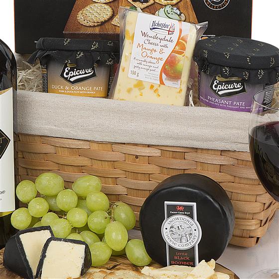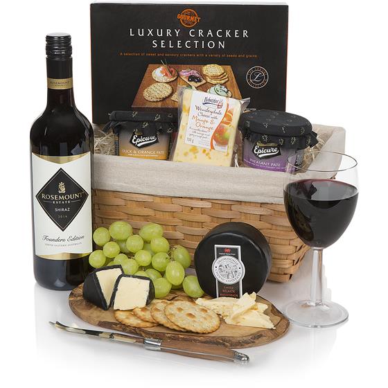 75cl Rosemount Founders Selection Shiraz 2015/6,Gourmet Luxury Cracker Selection 250g,Wensleydale with Mango & Orange 150g,Snowdonia Cheese Co Black Bomber 200g,Epicure Pheasant Pate 180g,Epicure Duck & Orange Pate 180g,LINED BAMBOO BASKET