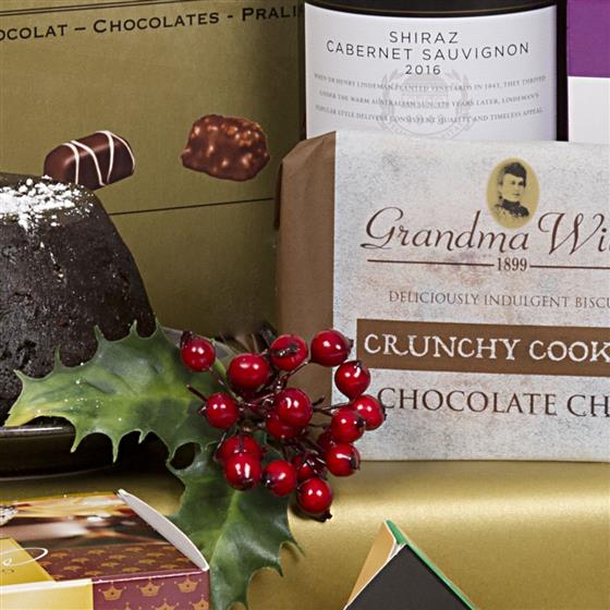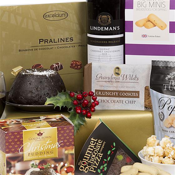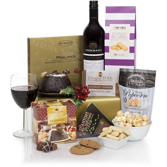 75cl Lindemans Winemakers Release Shiraz Cab Sauv 16,NibNibs Rosemary Mini Breadsticks 100g,Tommy Tucker Salted Caramel & Vanilla Popcorn 25g,Grandma Wilds Chocolate Chip Crunch Cookies 200g,Gold Crown Rich Fruit Christmas Pudding 454g,Xmas Excelcium Assorted Pralines in a Gold Box with Stars 180g,Gourmet Chocolate Pizza Company Christmas Slice 50g,Festive Carton