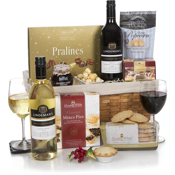 75cl Lindemans South African Merlot Cab Sauv 15,75cl Lindemans Winemakers Release Chardonnay 16,Grandma Wilds Oat Crunch Cookies 200g,Tommy Tucker Salted Caramel & Vanilla Popcorn 25g,Gold Crown Xmas Pudding 227g,Grandma Wilds 4 Lux Mince Pies with Brandy,Mrs Bridges Cranberry Sauce with Port 113g,Xmas Excelcium Assorted Pralines in a Gold Box with Stars 180g,LINED BAMBOO BASKET